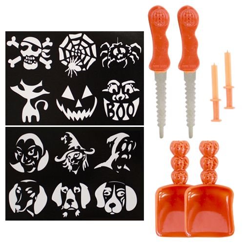 Halloween Pumpkin Stencils make it easy to carve the creepiest, most intricate pumpkin designs. These exciting stencils will bring hours of family fun! The set includes 12 unique stencil patterns in two packs of 6. Each pack also includes a Drill, Scoop, and Carving Saw. Simply select your favorite stencil, place it across the pumpkin, use the drill to punch the pattern into the pumpkin pulp, then carve out the punched pattern with the special saw. Stencil patterns include spooky spiders, creepy cats, skull & bones, vampires, witches, and more. Pumpkin Stencils can turn an ordinary jack-o-lantern into a spooktastically artistic Halloween masterpiece! Pick up your sets today!Customer Reviews